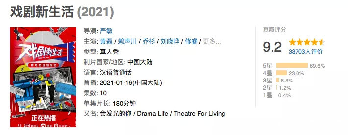 愛奇藝出品的《戲劇新生活》自開播之後,豆瓣評分就一直維持在9.2分。