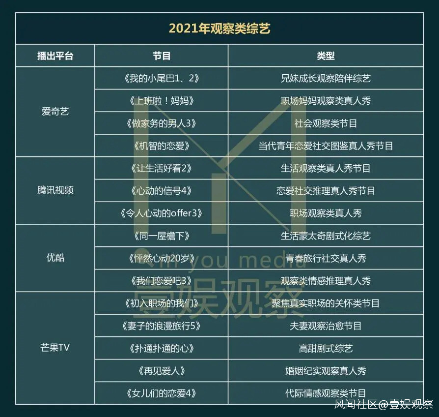 壹娛觀察(ID:yiyuguancha)統計發現,2021年綜藝市場共上線了15檔觀察類綜藝,其中熱門綜藝《我的小尾巴》完成了一年兩季的播出,綜藝裏萌娃的表現以及親子間温馨的互動,十分暖心,被網友稱為治癒小甜綜。