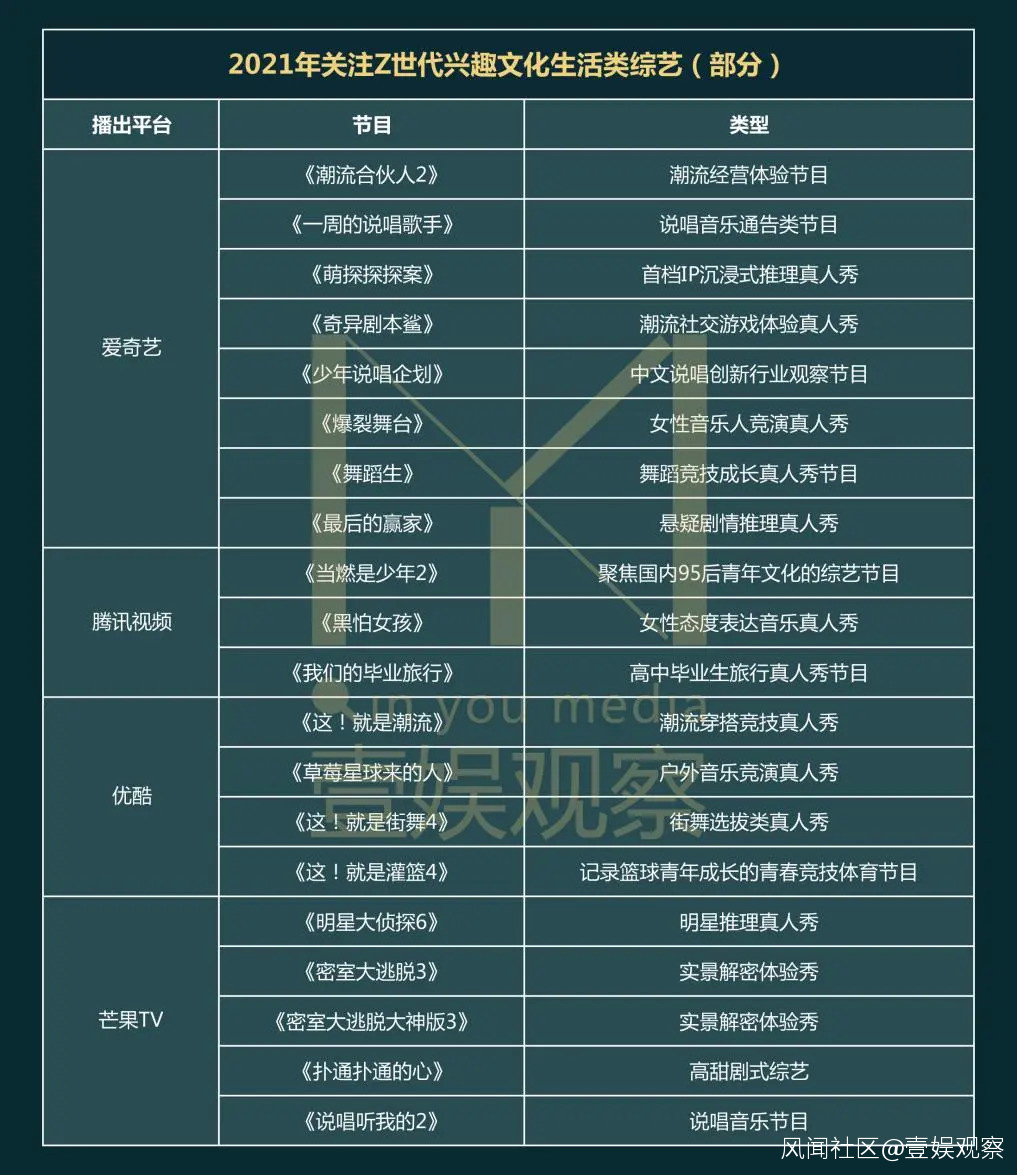 根據不完全統計,2021年共有20檔關注和呈現Z世代興趣文化生活的綜藝內容,觸角幾乎延伸到每個年輕人的興趣角落。