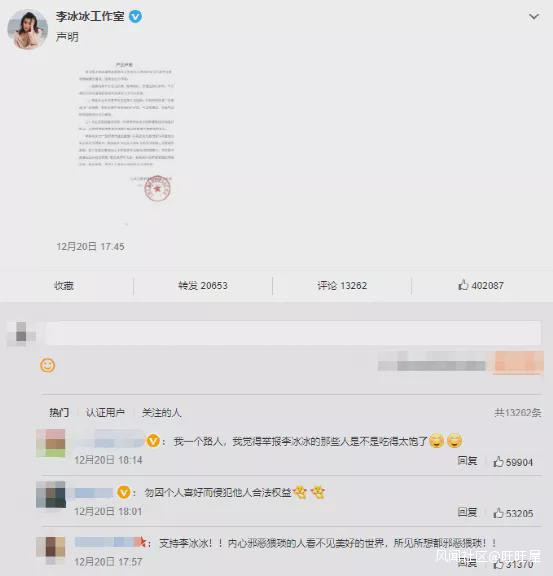 有一説一,這實在稱不上是值得詬病的點,很多女明星以往參加娛樂圈各大盛典時的打扮,比這要誇張多了。畢竟現在社會的觀念也比較開放,只要不漏點,也算是無傷大雅。如果僅憑此就被打上“穿着暴露”的標籤並且被舉報,那麼只能説明舉報者戴着有色眼光看待問題,思想與眼界未免有些狹隘。也是因此,才有不少網友替李冰冰鳴不平,直言她的打扮沒問題。12月20日,李冰冰工作室也對此事作出回應,發表了一則相關聲明。聲明內容主要為三點。首先,視頻為平台官方拍攝,剪輯製作,皆通過預先審核,平台確定無任何違規信息後李冰冰方予發佈。其次,賬號僅發佈2條視頻,而針對網傳所謂舉報成功的視頻,目前在平台依然可見,可正常播放,以此為證,所有視頻均符合平台規定。最後,工作室則是對侮辱、誹謗李冰冰的涉嫌侵權行為進行取證,後續將追究相關法律責任。