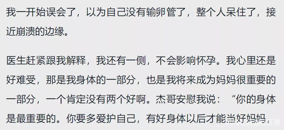 每個女人成為媽媽背後是不為人知的擔驚受怕謝娜手術後,一度誤以為輸卵管被全部切除。整個人都呆住了,接近崩潰的邊緣。醫生安慰她,切除的是一側輸卵管,不影響生育。可她心裏還是很難受,那是身體的一部分,也是將來成為媽媽很重要的一部分,一個肯定沒有兩個好。