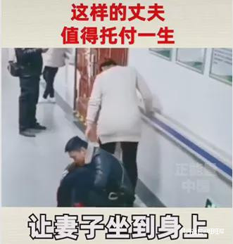 還有前兩天網上兩個視頻,一個是丈夫陪妻子去產檢。醫院走廊裏都是人,沒有坐的位置,丈夫就蹲下來當人肉坐墊,讓妻子坐在自己的後背上。
