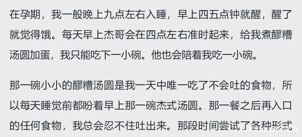 果然,婚後第6年謝娜懷孕後,張傑對她呵護備至。謝娜夜裏疼得翻來覆去睡不着,張傑就陪着她起來到陽台上緩緩;謝娜每天早上4點多,都會吃一碗醪糟圓子,那是她一天唯一一頓不會吐出來的飯。