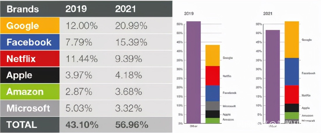 在應用端,4G普及之後,互聯網業態繼續高速發展,讓巨頭的身位更加龐大。網絡監控公司Sandvine的數據顯示,2021年,谷歌、Facebook、Netflix、亞馬遜、微軟和蘋果六大巨頭產生了超過56%的全球網絡流量,他們在2021年產生的流量佔比超過了所有其他互聯網公司的總和。