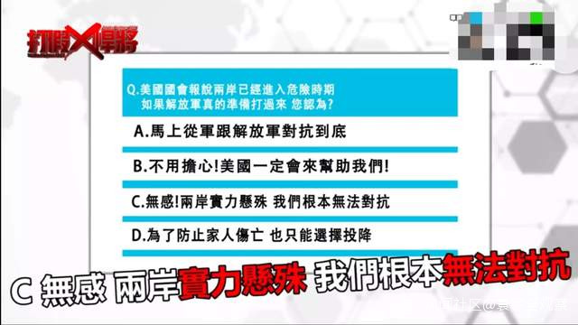 第一組受訪者的選擇就是C選項,當被問到原因的時候,他直接回答説,美國是不可能過來的,他們也許會對台灣有一點援助,但肯定不可能犧牲到太多。畢竟大陸一旦打過來,幾天大概就爛掉了,就掛了,差距太大了。