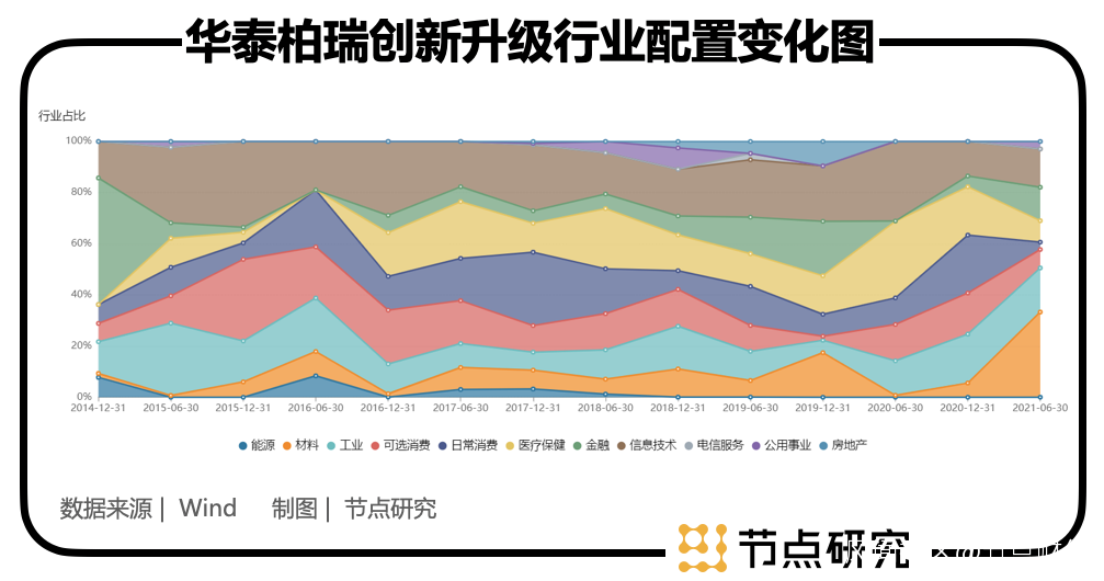 我們先不聽張慧是怎麼説的,先看他是怎麼做的。還是以華泰柏瑞創新升級為例——行業涉獵廣,相對均衡,根據行業景氣度局部重倉,跟隨市場風格,行業配置結構變化頻繁且大。