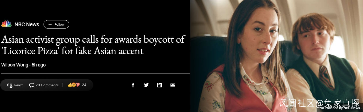 NBC: 亞裔美國積極行動組織呼籲對導演保羅·托馬斯·安德森 (Paul Thomas Anderson) 的“甘草比薩”使用假亞洲口音進行頒獎抵制。