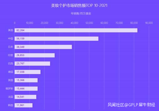 數據顯示,與家電行業不同,當前全球最大的美妝個護市場是美國,2021年預計實現銷售額822.64億美元,其次是中國,2021年銷售額預計為561.59萬美元,緊接着是日本、印度、巴西以及歐洲各發達國家。