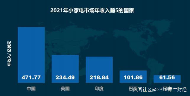據Statista預測,2021年中國小家電收入預計為471.77 億美元,比排名第二的美國的234.49億美元高出一倍,印度、巴西和日本預計將成為第三、第四、第五大市場。