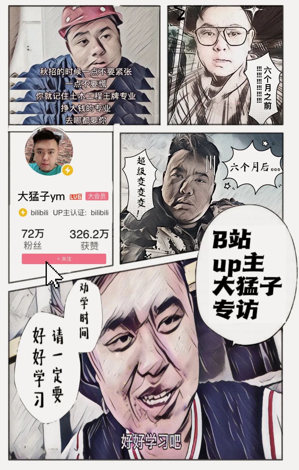 他憑着拍攝土木人工地生活的點點滴滴成為70多萬粉絲的bilibili知名UP主。目前b站粉絲72萬人,單篇播放量最高達400萬次,獲點贊326.2萬餘次,累計播放量超6000萬次;同時他也參與了中央電視台《開講啦》的節目錄制,相關事蹟刊登在中國青年報、新週刊等十餘家媒體平台,累計閲讀量近百萬次。