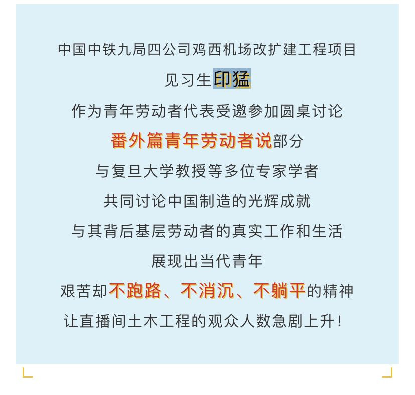今天是猛子我“膨脹”的一天,來到中鐵建工集團中國電科科技創新園工程項目部,參觀了施工現場和項目生活區,切身感受了現代化工地的先進,當然也看到了與猛子一樣頂着風,頂着雨,頂住各種工作壓力,堅守在一線工地的青年。工地確實艱苦,但依然有很多人,也必須有很多人堅守自身崗位。有的人可以當房屋的棟樑,有的人去當小小的螺絲釘,每個人都在為了國家建設付出自己的貢獻與努力。