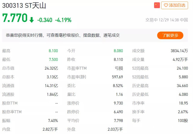自2020年9月8日的巔峯價34.66之後,ST天山就展開了長久的下坡路。隨着ST天山重組案被騙損失巨大,年內跌幅達到63.13%。若2022年營收仍不到1億元且淨利潤為負,ST天山將直接退市。
