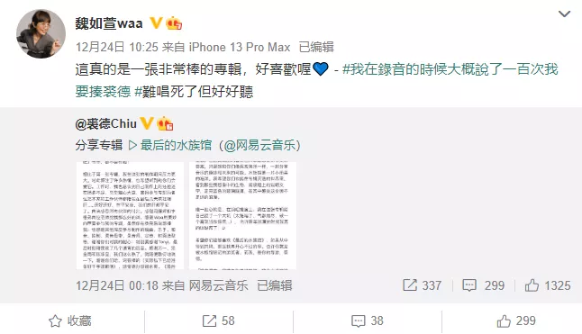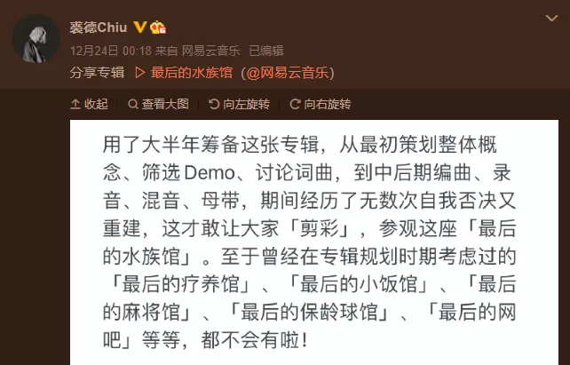 微博裏也有他的一段自述:用了大半年時間籌備新專,《最後的水族館》比上一張思考了更多投入了更多,熬通宵幹活也是常事。