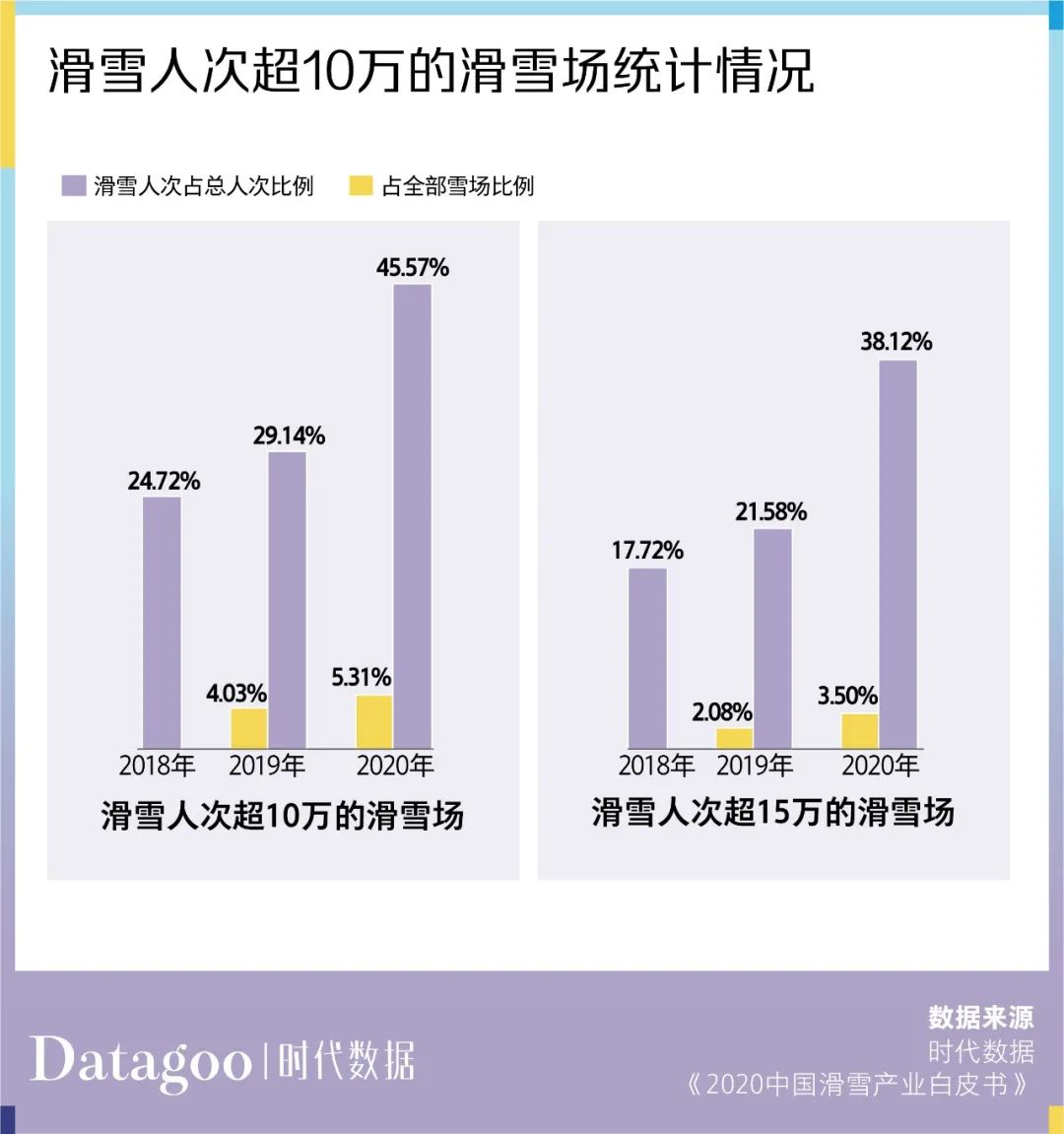 同時,10萬人次以上以及 15 萬人次以上雪場的滑雪人次佔比相比 2018 年及 2019 年有大幅度提升,表明滑雪人次的集中度越來越高。