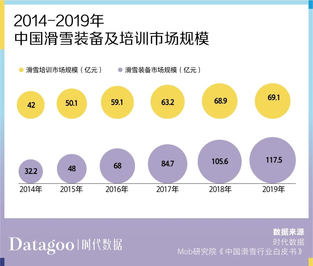從 2014 年到 2019 年,中國滑雪裝備市場規模從 32.2 億元增長至 117.5 億元,擴大了近四倍。滑雪培訓市場規模從 42 億元增長至 69.1 億元,年均增長 10.47% 。