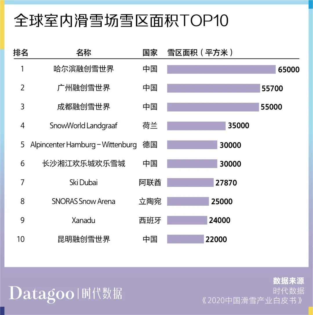 **中國室內滑雪場不僅在數量上傲視其他國家,在面積上也是當之無愧的王者。**哈爾濱、廣州與成都的三家融創雪世界即斬獲世界前三,前十榜單中,中國的室內滑雪場佔到了五家。