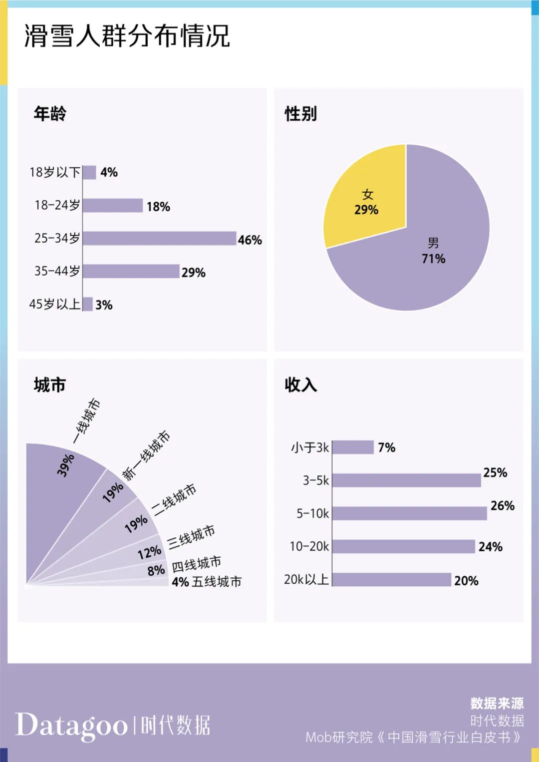 從收入層級來看,單月收入過萬的滑雪者佔比達 43.3%,這部分人收入相對較高,消費升級意願較強。