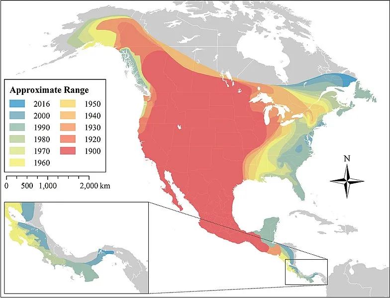1900年來郊狼的棲息地的分佈和擴大。圖片來源:wikipedia