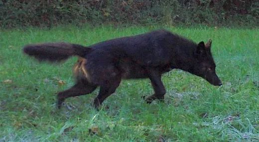 黑毛郊狼都是雜交的,它們的黑款毛色來自狗或狼攜帶的基因突變。圖片來源:wikipedia