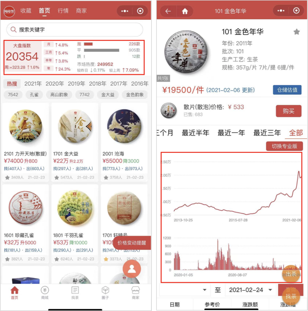 每個產品都有記錄價格的K線圖,甚至出現了專門跟蹤大益茶走勢的平台。