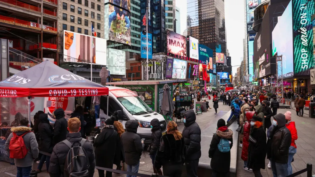 紐約市時報廣場附近,人們在排隊等待進行新冠檢測。