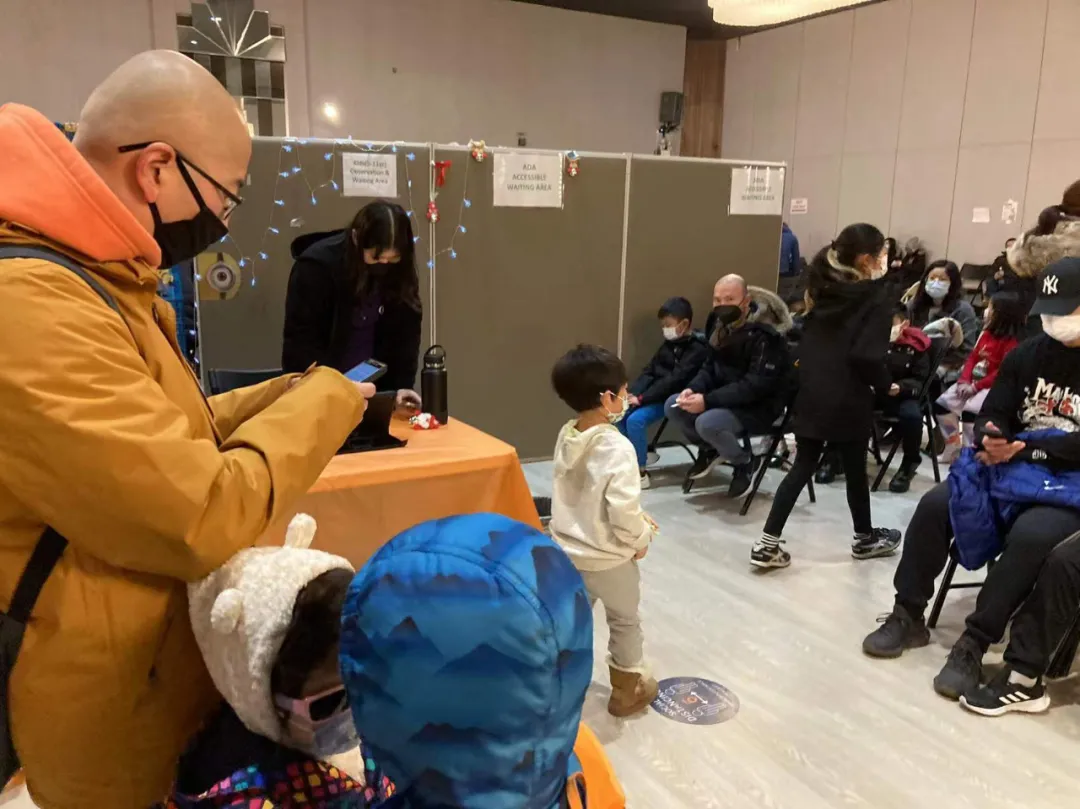 12月27日,在紐約市的一處疫苗接種點,家長們帶着孩子在等候接種疫苗。(攝:江南)