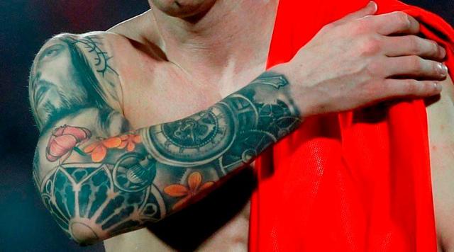 梅西的右臂,左腳和背後的紋身,據説都和他的宗教信仰,家庭和事業有關