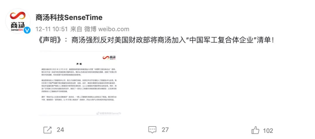 次日,商湯科技通過官方微博就此事發布了聲明。聲明中,商湯科技表示,對於這一決定與相關指控表示強烈反對。“我們認為該決定與相關指控毫無根據,反映對公司的根本性誤解。”