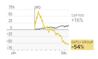 Oatly的股價走勢(黃),目前已低於發行價54%,數據源:華爾街日報