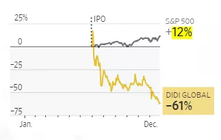 滴滴出行的股價走勢(黃),目前已低於發行價61%,數據源:華爾街日報