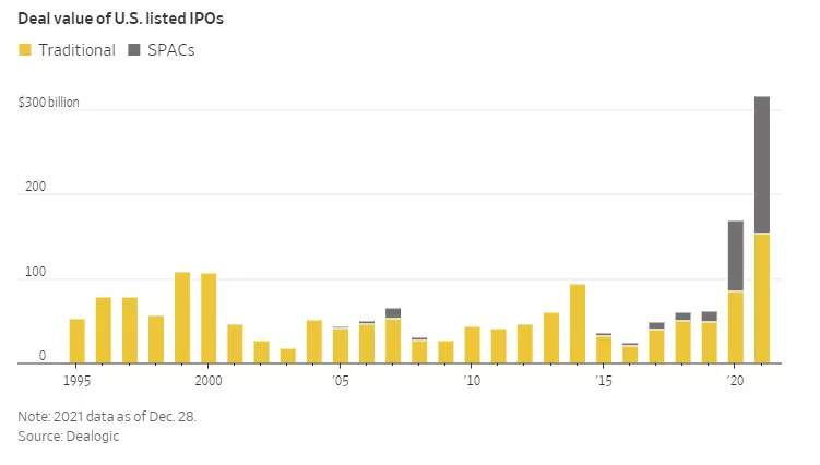 2021年,由於創業公司的創始人和早期投資者試圖從天價估值中套現,傳統的IPO籌集的資金比以往任何時候都多。在今年的前八個月,IPO公司的股價上漲。根據Dealogic的數據,在11月,2021年的IPO公司股價平均上漲12%。到12月下旬,它們的股價比IPO價格低9%。