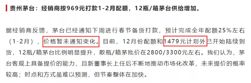 另外,調研還提到12月1479元計劃外配已經開始到貨。這個信息也比較關鍵。在12月初市場就傳出給傳統經銷商額外投放800噸配額,打款價1479元,茅台對這一情況始終沒有正面回應,調研反饋也坐實了這一情況。
