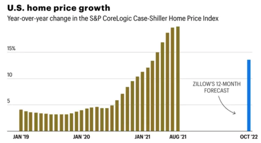 根據美國房地產機構Zillow預計,未來一年美國房價還將增長13.6%,恐怕短時間內是難以下降了。