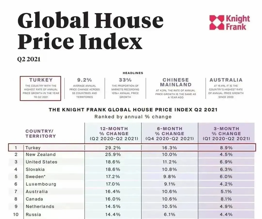 文章開頭提到的**土耳其,房價上漲了29.2%,漲幅目前位居全球第一位。**這也就是為什麼中介不得不兩天改一次房價的原因了:房價增長得實在是太快了。