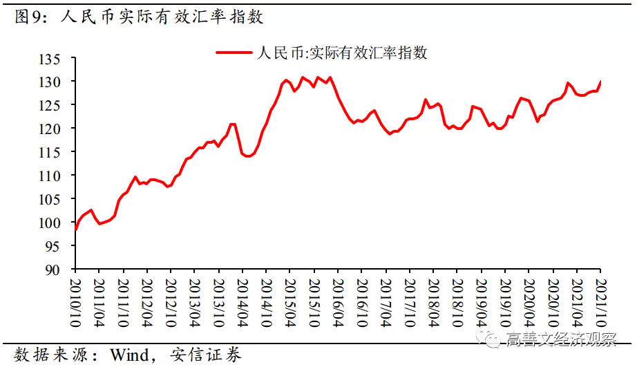**第一,**如圖9所示,在剔除了通貨膨脹和美元幣值波動的影響後,可以看到在過去十年的時間裏,人民幣實際有效匯率大幅上升,累計升值幅度接近30%,年均升值幅度超過2%,較1997年以來的長期歷史趨勢更快一些。