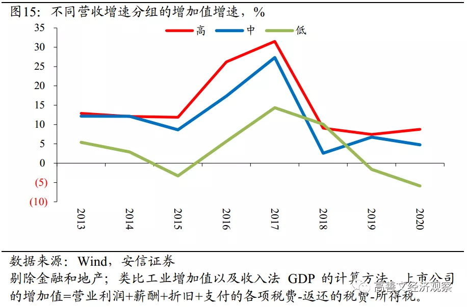**首先,**如圖15所示,按照國民經濟核算的標準定義,可以將公司的營業收入轉換為其所創造的增加值,可以發現增加值增速在不同組別之間的表現基本與預期一致:即不同組別增加值增速的變動方向大體接近;在絕對水平上,高、中、低增長組分別對應由高到低的增加值增速。