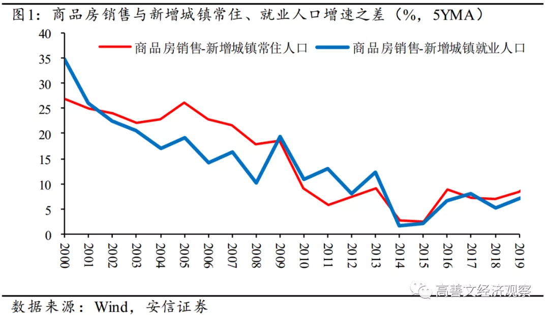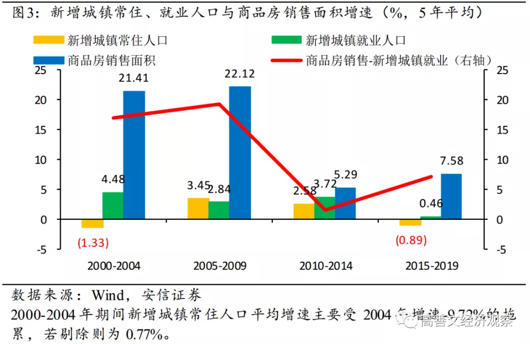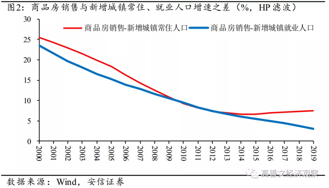 在此基礎上,我們對數據做一些更仔細的觀察:處理方法是每五年計算一次房地產銷售面積以及新增城鎮人口的平均增速,將二者作差後觀察其變化。