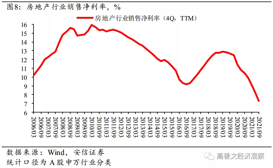 房地產行業的銷售淨利率,如圖8所示,2015年也是分水嶺。在此之前,行業銷售淨利率的中樞水平比較高,而在此之後,行業銷售淨利率的中樞出現明顯的下沉。
