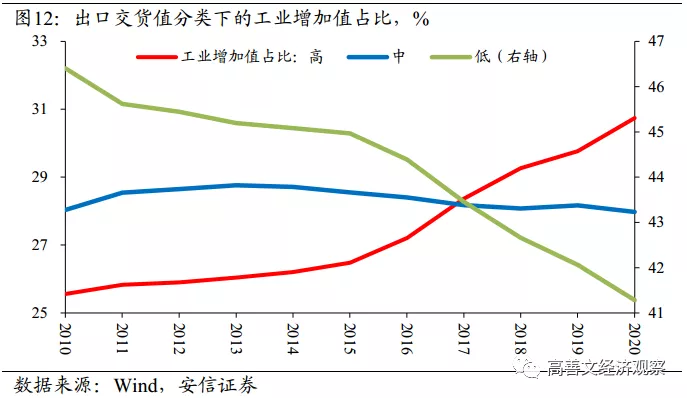 但是在當下的絕對水平上,低增長組仍然比高增長組高出差不多10個百分點。如果我們以此作為評判的標準,可以説過去十年,特別是過去五年中國工業結構經歷了快速的轉型,但現在仍然是由傳統產業來主導的。
