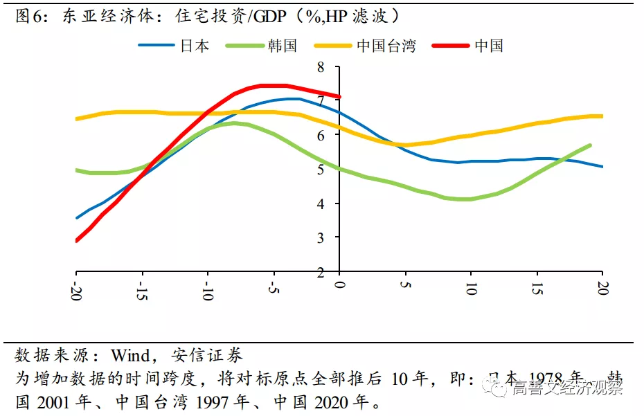 按照相似的方法,進一步對比東亞經濟體的住宅投資佔GDP比重,觀察該指標在各經濟體見頂的時間。如表2所示,平均來看,其他東亞經濟體在轉型開始大約4年後,住宅投資佔GDP的比重見頂。而中國的表現也較為相似,即在對標時點的5年後,也就是2015年到達頂點。