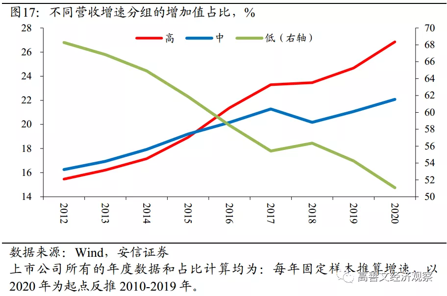 具體來説,2015年以後低增長組的佔比從46%下降到了41%,而高增長組的比重從26%上升到31%,兩者之間的差距經歷了約10個百分點的縮小。