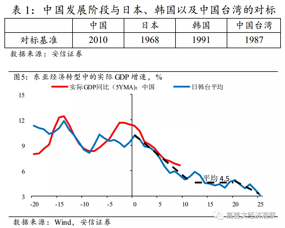 沿着這樣的思路出發,通過人均GDP、第二產業相對第三產業佔比等指標,我們發現中國2010年的經濟發展程度,相當於1968年前後的日本、1991年前後的韓國和1987年前後的中國台灣。在這樣的條件下,我們把中國的GDP增長率,與其他東亞經濟體進行對比,其表現的趨勢是比較接近的。