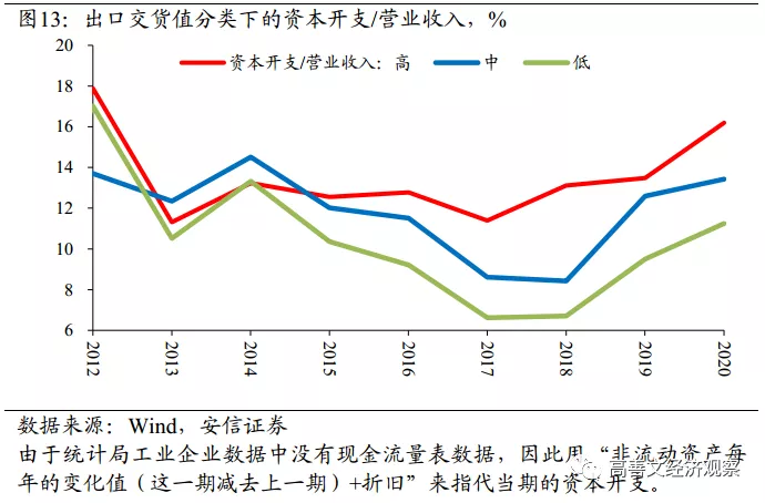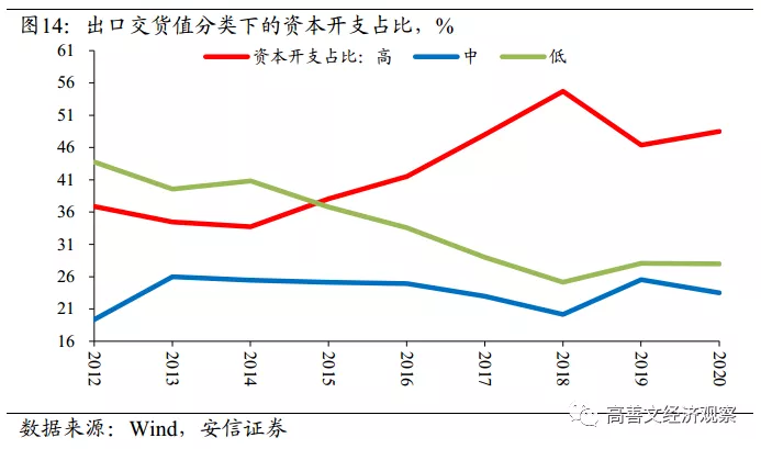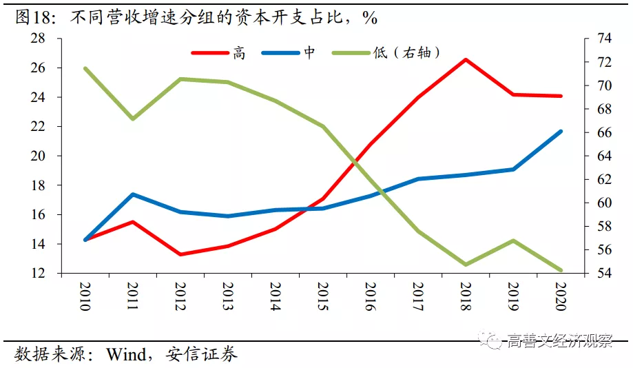 如圖13、14所示,從資本開支佔營業收入比重的數據來看,2015年之前不同組別的表現大致相近,但此後高增長組的資本開支/營業收入要高得多。由此產生的結果是,高增長組的資本開支的佔比大幅提升,在當前整個工業的資本開支中佔比約50%,而低增長組則在30%以下。
