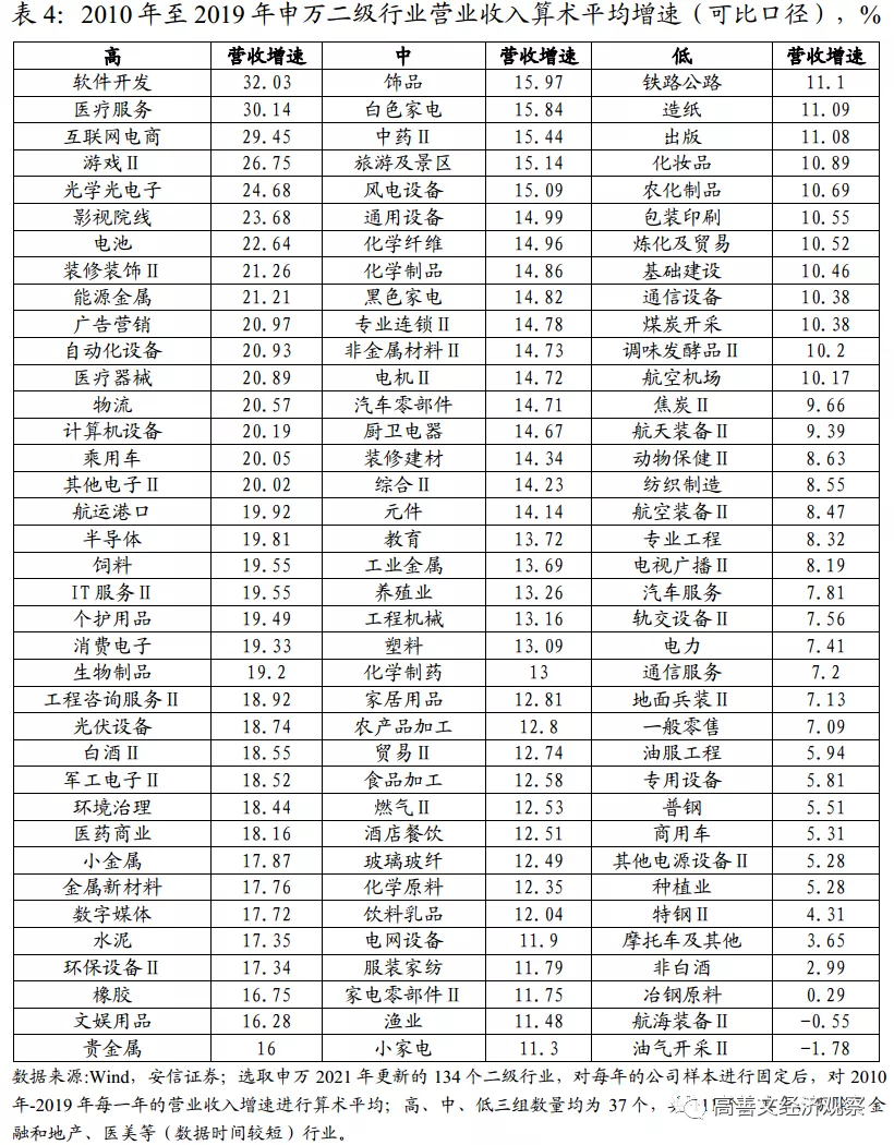沿着對工業數據進行處理的類似思路,可以把上市公司數據分組。在樣本可比的情況下,對過去十年上市公司營業收入的長期增速從高到低進行排序,在顆粒度上精確到110餘個二級細分行業(我們排除了金融和房地產行業)。