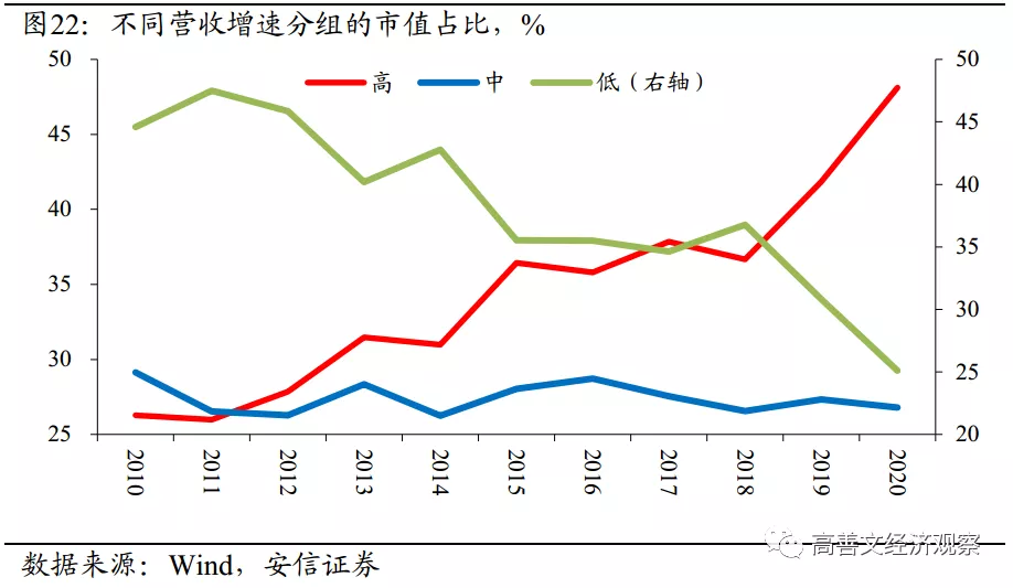 如圖22所示,2010年高增長組的市值佔比大概是26%,到2020年已接近50%;而低增長組的市值佔比在2010年接近45%,到2020年已下降到了25%;中增長組的市值佔比則一直穩定在25%-30%之間。