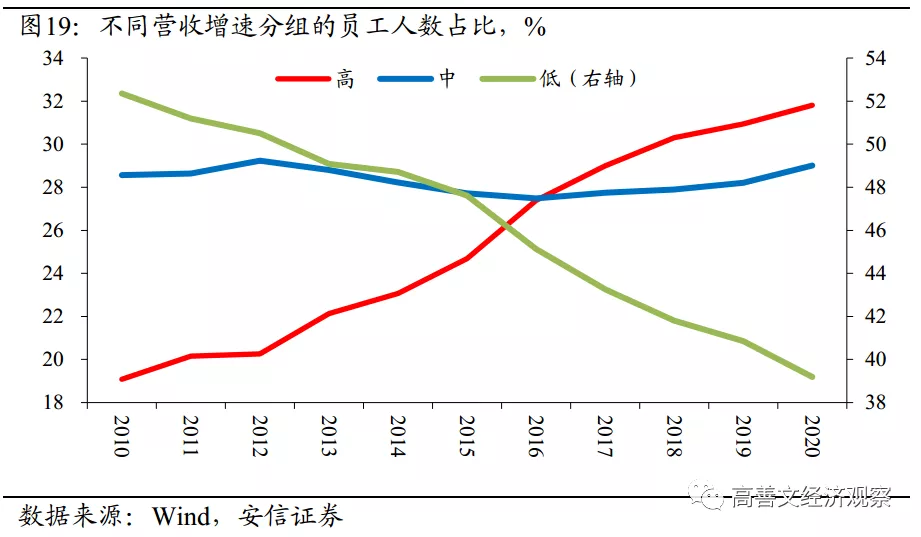 **從僱傭人數角度來看,**如圖19所示,高增長組的員工人數佔比從19%上升至32%,而低增長組從52%持續下滑至39%。