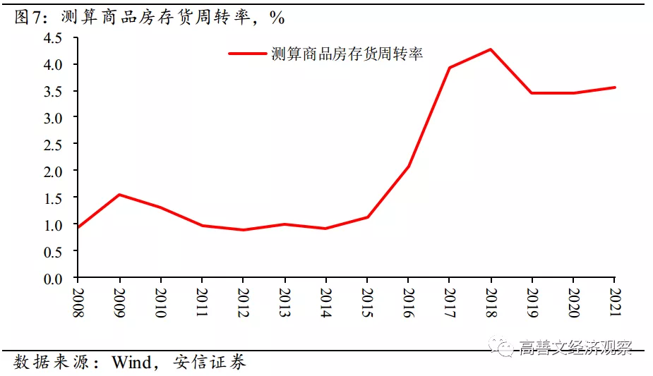 從商品房存貨(我們這裏定義的存貨是指累計的已開工未銷售面積)週轉率的數據來看,如圖7所示,2015年是重要的分水嶺,在此之前,行業總體上存貨週轉率較低,而在此之後,存貨週轉率的中樞大幅提升。