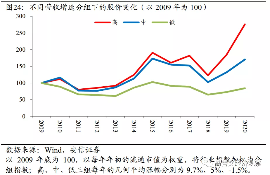 如圖23、24所示,高增長組的股價指數從2010年初的100漲到2020年接近250的水平,而低增長組的股價到2020年則從100下降到了95。簡單地計算年均複合增長的話,高增長組的年均股價漲幅接近10%,中增長組接近4%,而低增長組則是負增長。