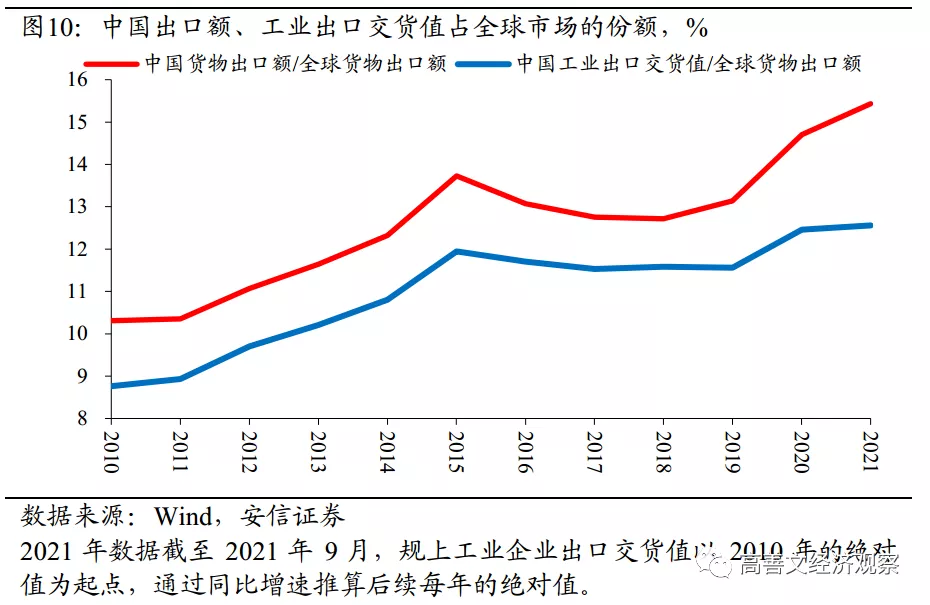 **第二,**如圖10所示,過去十年中國出口佔全球市場的份額總體上升,其中2015-2018年短暫回落,可能與那段時間的匯率高估有關,但2019年以後,出口份額止跌回升。