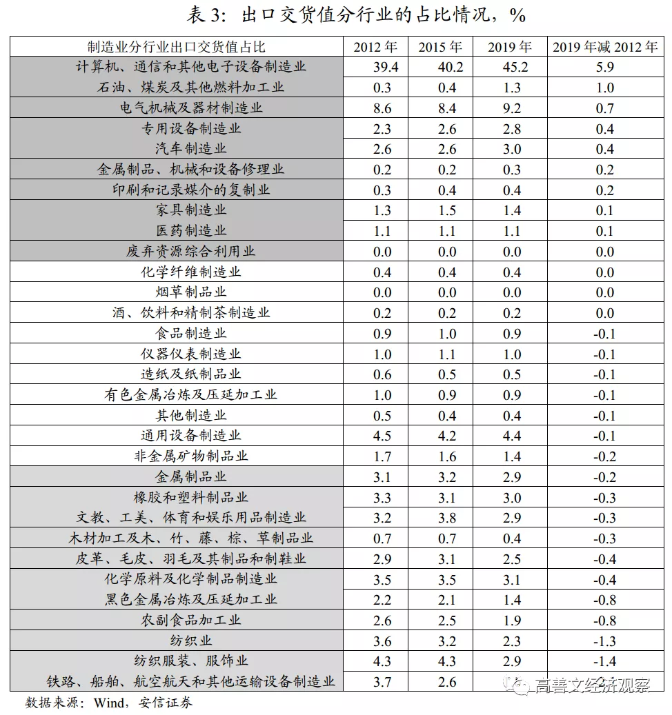 一個簡便的方法是計算細分行業出口在總出口之中份額的變化來衡量其競爭力的變動。這一指標的瑕疵在於,如果一個細分行業在全球貿易中的份額在明顯提升,那麼指標變動的含義就比較模糊。
